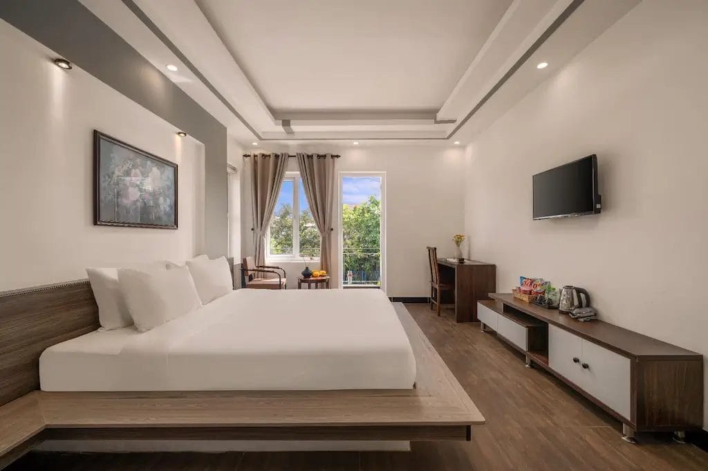 Deluxe Double Room rộng 30m2 được thiết kế hiện đại, ấm cúng với 1 giường đôi lớn, mang đến không gian nghỉ ngơi thoải mái cho 2 người. Phòng sở hữu tầm nhìn hướng ra ngoài trời, đón ánh sáng tự nhiên và không khí trong lành, tạo cảm giác thư giãn ngay từ khi bước vào. Nội thất tiện nghi, bố trí hài hòa cùng không gian thoáng sáng giúp du khách tận hưởng kỳ nghỉ trọn vẹn, lý tưởng cho cả du lịch và công tác.