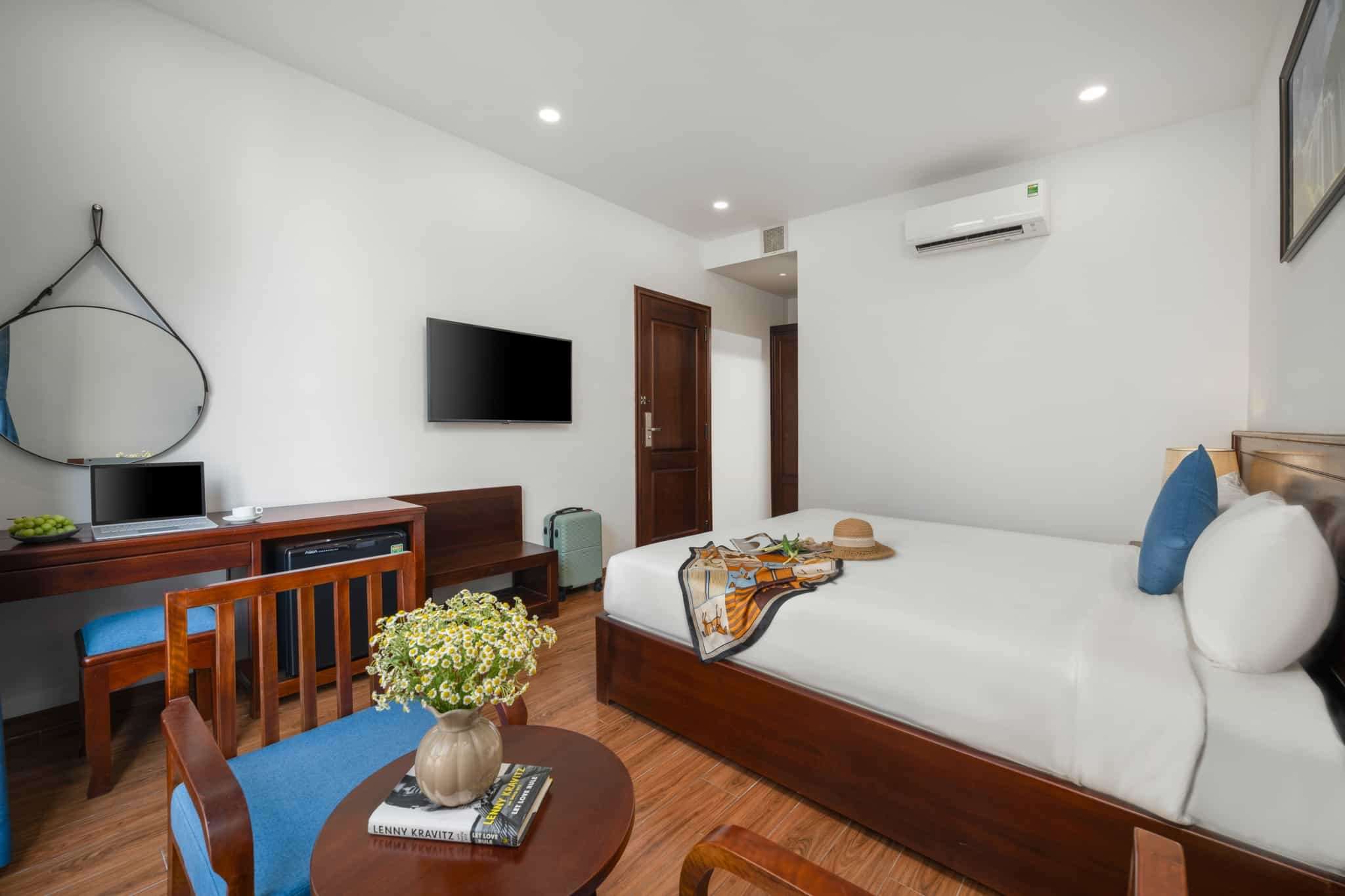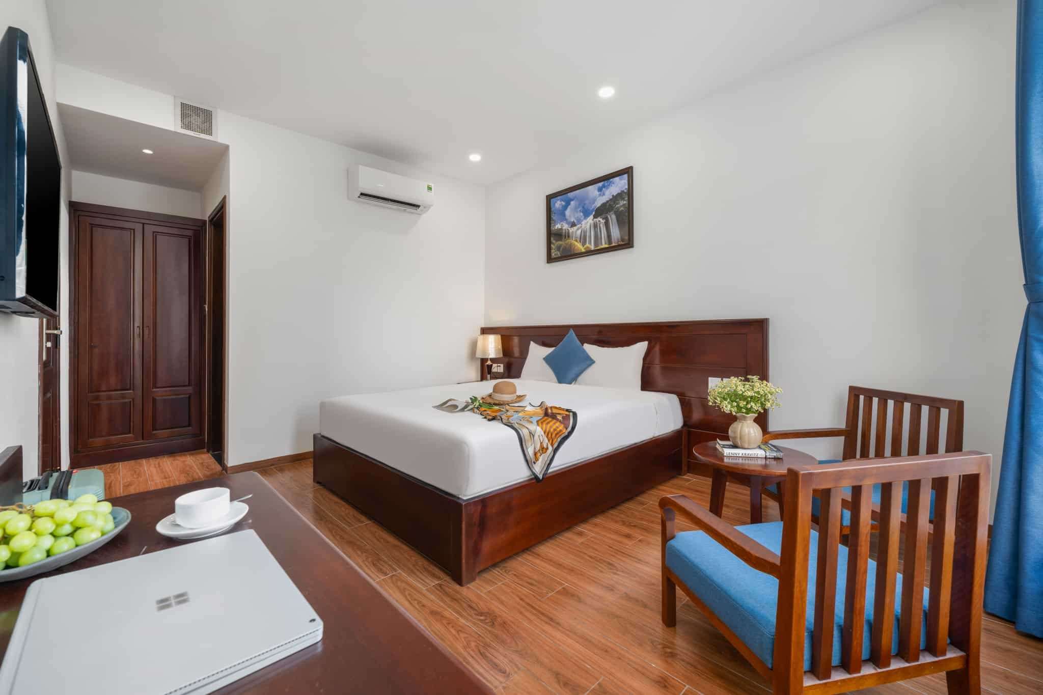Phòng nghỉ tại khách sạn được thiết kế mới mẻ, sạch sẽ và đầy đủ tiện nghi. Nội thất gỗ hiện đại không chỉ mang đến vẻ đẹp sang trọng mà còn tạo cảm giác ấm áp, gần gũi. Mỗi phòng đều được trang bị các tiện ích cần thiết như điều hòa, tivi màn hình phẳng, minibar và wifi miễn phí, giúp bạn có những giây phút thư giãn thoải mái nhất.