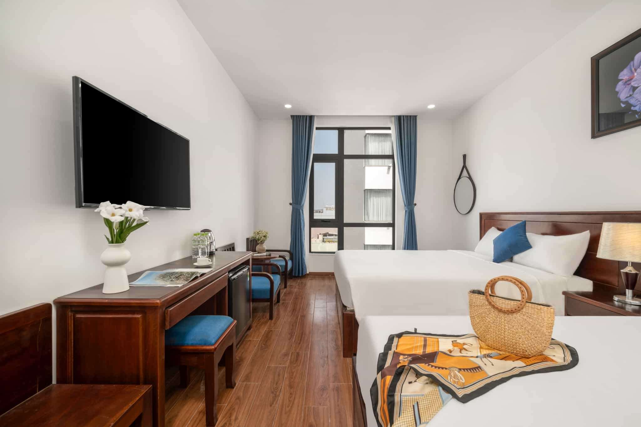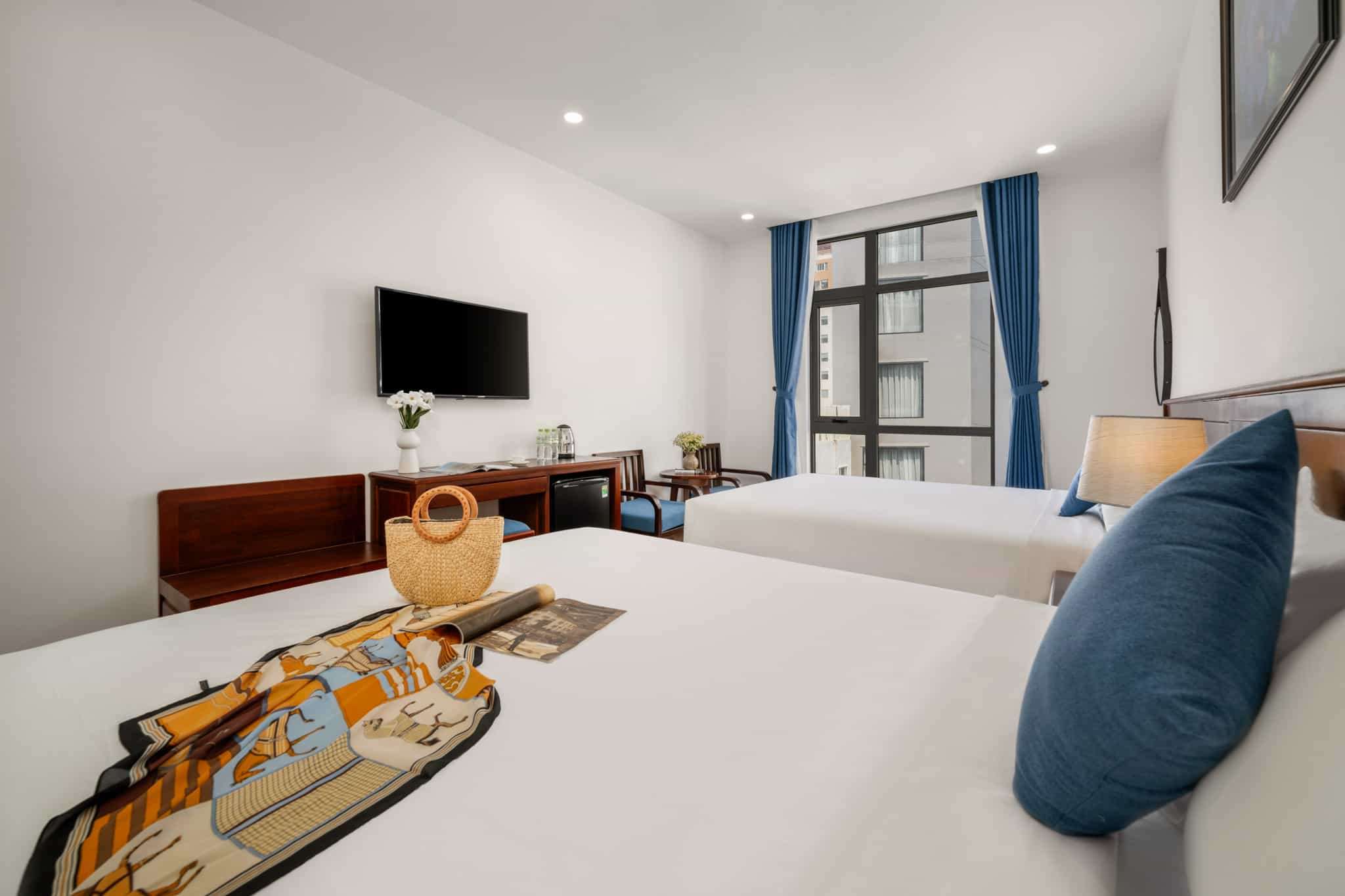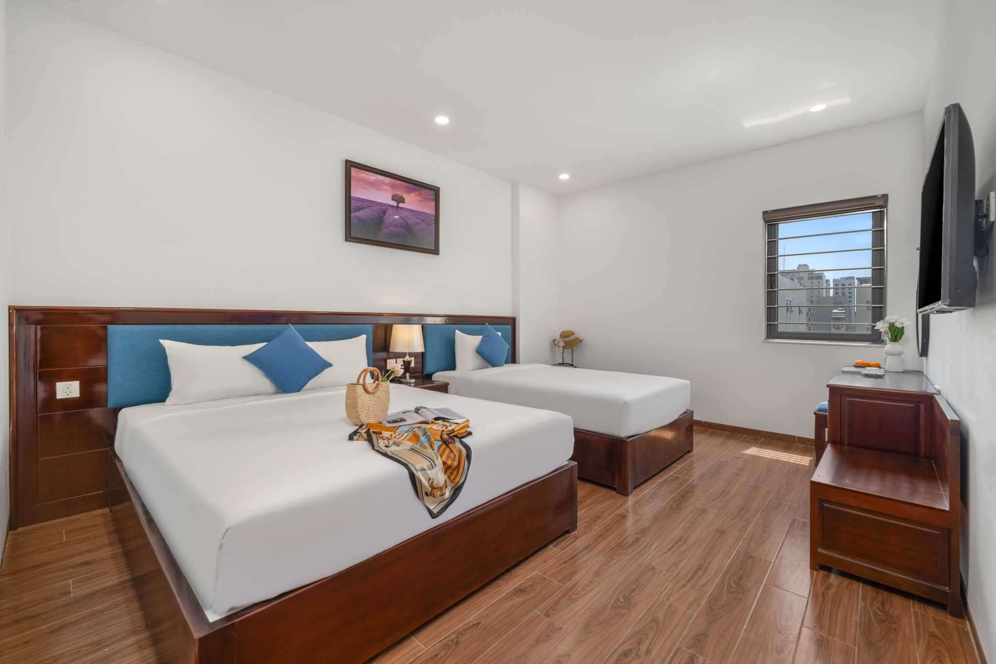 Phòng deluxe giành cho 3 người là lựa chọn hoàn hảo cho nhóm bạn hoặc gia đình nhỏ với 1 giường 1m6 và 1 giường 1m2. Phòng có một ô cửa sổ nhỏ, mang lại ánh sáng tự nhiên và không khí thoáng đãng. Với sức chứa tối đa 4 người lớn, đây là nơi lý tưởng để bạn cùng những người thân yêu tận hưởng kỳ nghỉ. Mặc dù không thể kê thêm giường phụ, nhưng không gian rộng rãi và thoải mái sẽ khiến bạn cảm thấy dễ chịu và thư giãn sau những giờ khám phá Đà Nẵng.