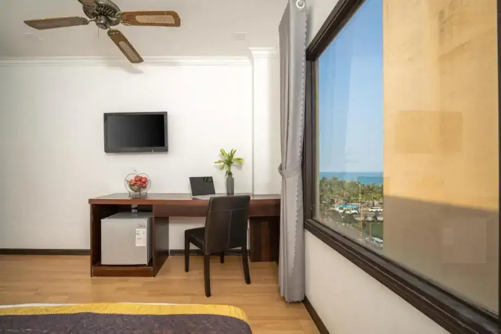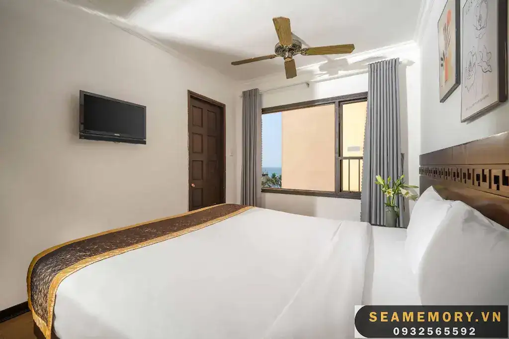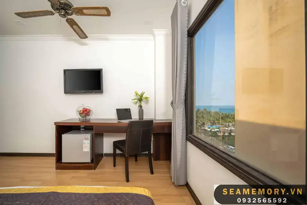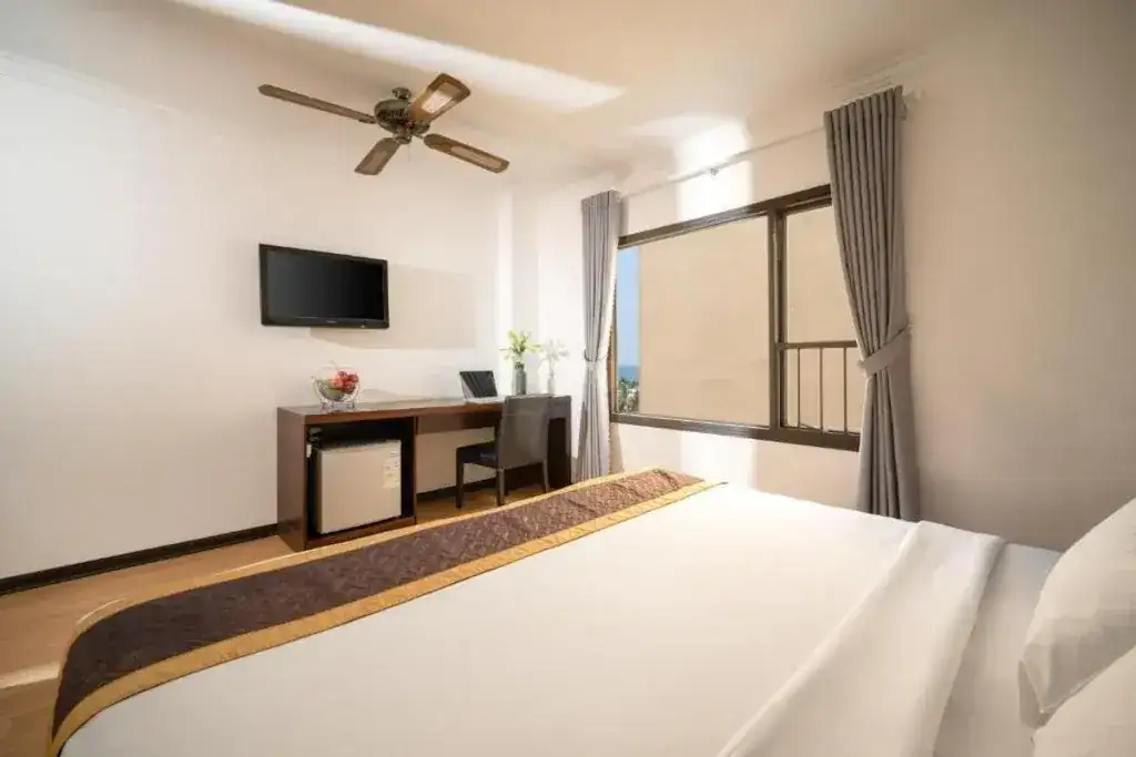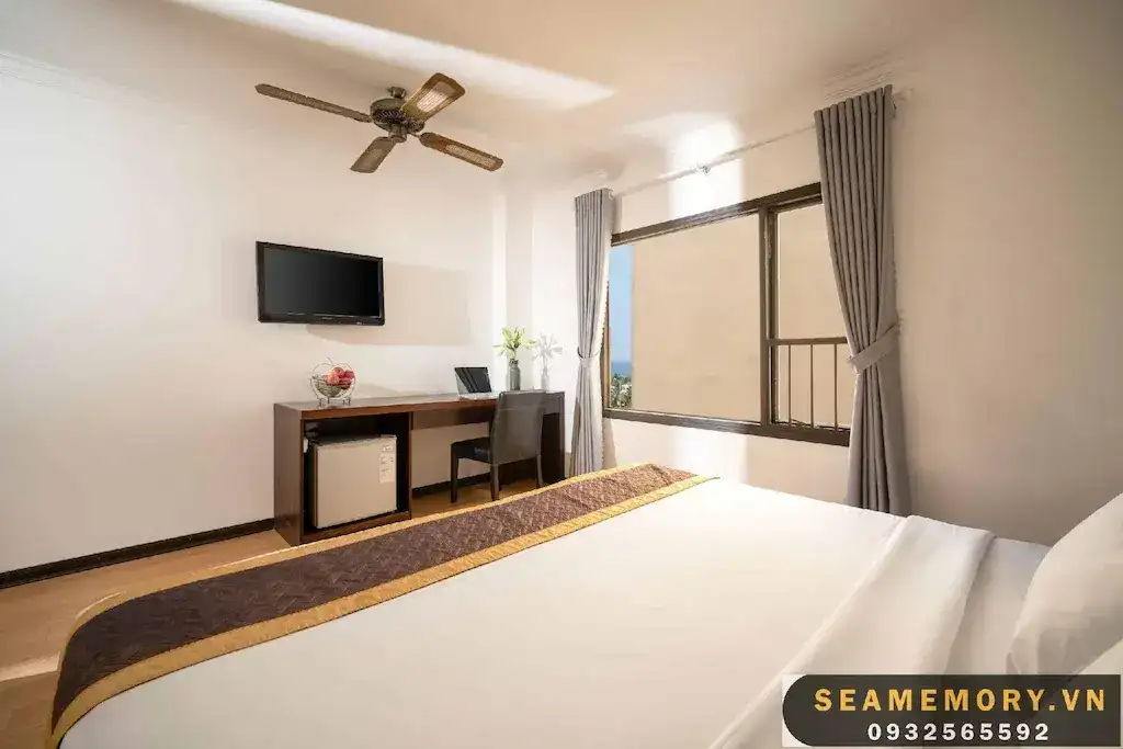Phòng Loại Sang Hướng Biển Giường Đôi Lớn rộng 22m2, được trang bị 1 giường đôi lớn, mang đến không gian nghỉ ngơi thoải mái và dễ chịu. Phòng có cửa sổ lớn hướng biển, đón ánh sáng tự nhiên, tạo cảm giác thoáng đãng và tươi mới. Nội thất đầy đủ tiện nghi với các trang bị hiện đại, mang đến sự tiện lợi và tiện nghi tối đa cho khách lưu trú. Với không gian sáng sủa và đẹp mắt, đây là lựa chọn lý tưởng cho những ai tìm kiếm một kỳ nghỉ thoải mái, giá cả phải chăng nhưng không thiếu tiện nghi.