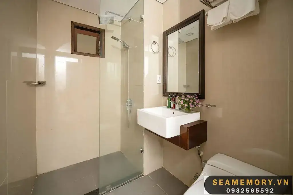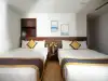 Phòng Đôi Tiêu Chuẩn có diện tích 18m2, trang bị 2 giường đôi lớn, mang đến không gian rộng rãi và thoải mái cho du khách. Phòng có cửa sổ lớn hướng biển, đón ánh sáng tự nhiên, tạo cảm giác thoáng đãng và dễ chịu. Nội thất đầy đủ tiện nghi, từ tủ đồ đến bàn ghế, đảm bảo sự tiện lợi và thoải mái tối đa. Với không gian sáng sủa, dễ thương và giá cả phải chăng, phòng này là lựa chọn lý tưởng cho những ai tìm kiếm một nơi nghỉ ngơi sạch sẽ, tiện nghi và thuận tiện tại khách sạn.
